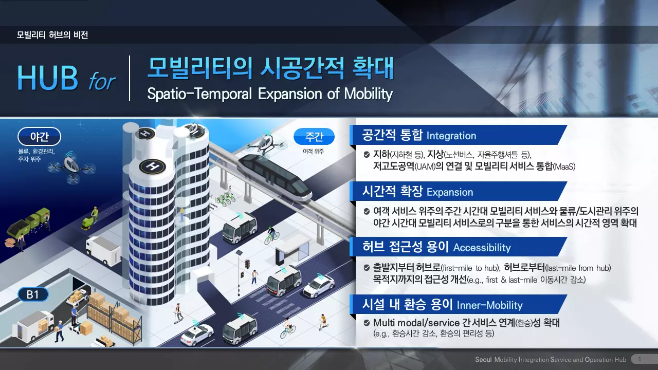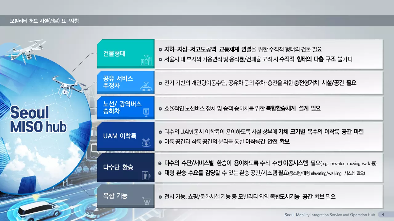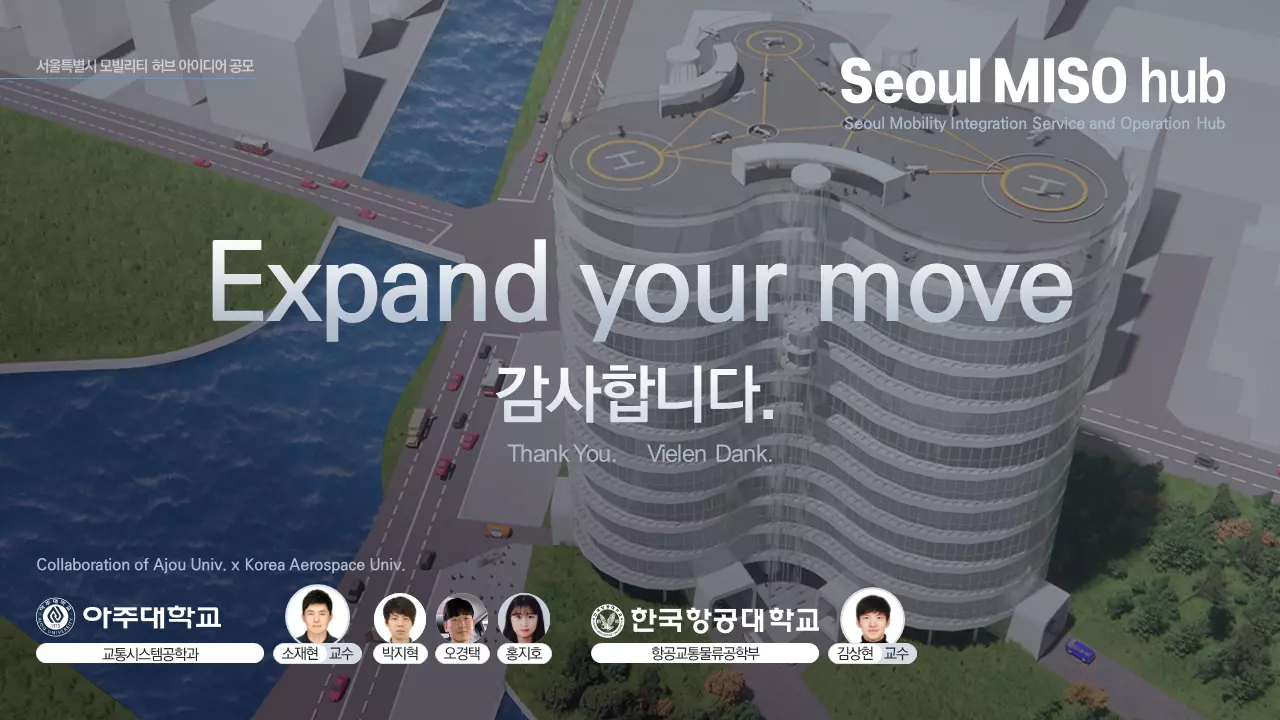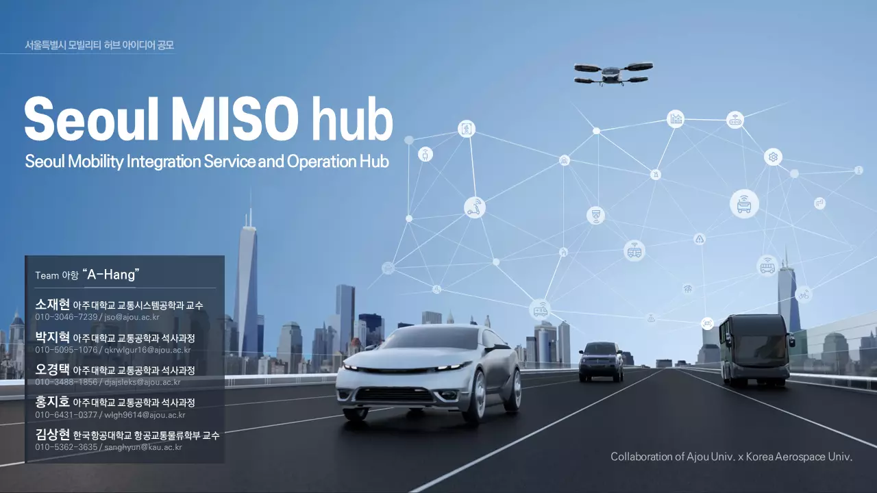 연구팀은 ‘Seoul MISO Hub(Seoul Mobility Integration and Service Operation Hub)’라는 제목으로 아이디어를 출품했다. 이는 기존 대중교통체계와 자율주행·도심항공교통·개인형이동장치 기반 모빌리티 서비스가 연계해 주간과 야간 또는 지하·지상·저고도공역 등 모빌리티 서비스의 시공간적 확대를 위한 모빌리티 허브를 담고 있다. 기획안에는 모빌리티 허브의 비전 및 목표와 더불어 기능, 시설 유형에 따른 지점 선정, 시설 요구사항, 서비스 효용 극대화 전략 등을 담았다.