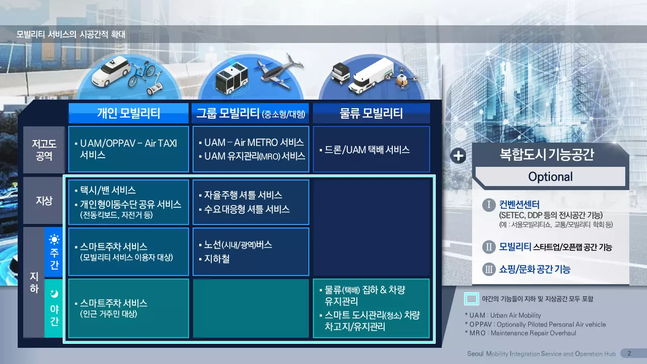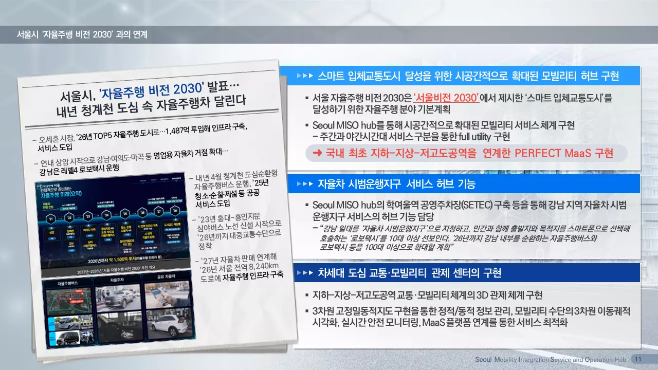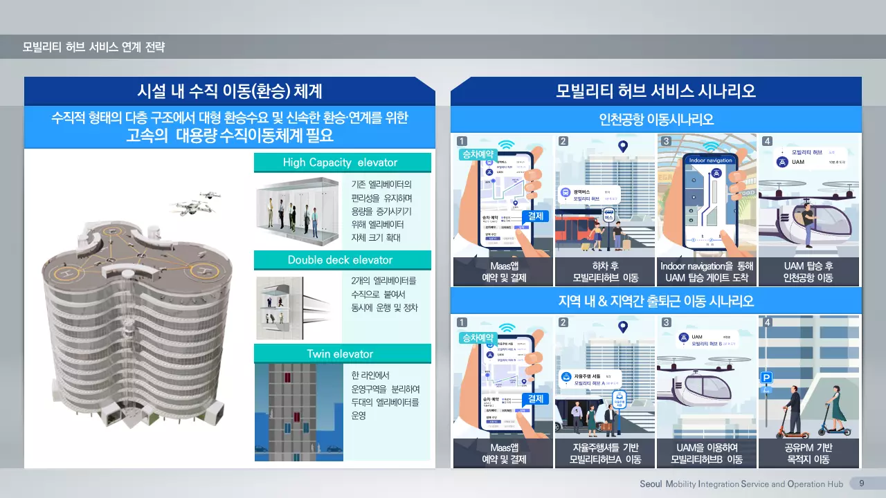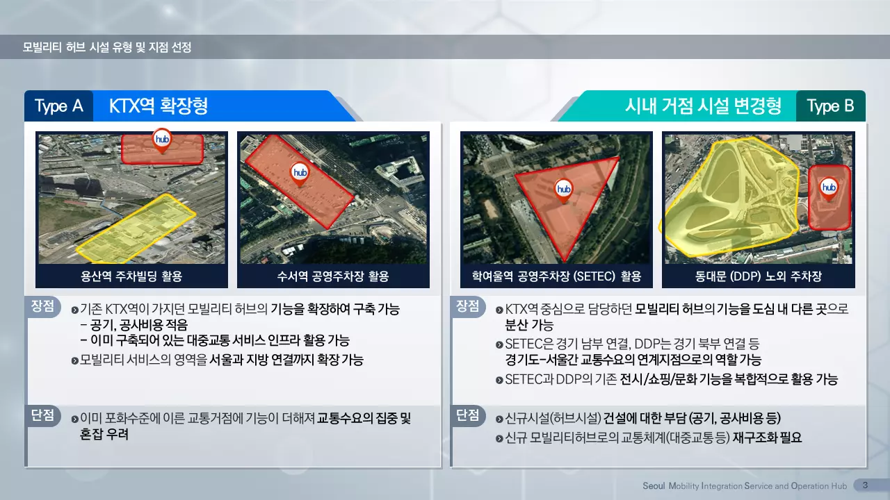 연구팀은 ‘Seoul MISO Hub(Seoul Mobility Integration and Service Operation Hub)’라는 제목으로 아이디어를 출품했다. 이는 기존 대중교통체계와 자율주행·도심항공교통·개인형이동장치 기반 모빌리티 서비스가 연계해 주간과 야간 또는 지하·지상·저고도공역 등 모빌리티 서비스의 시공간적 확대를 위한 모빌리티 허브를 담고 있다. 기획안에는 모빌리티 허브의 비전 및 목표와 더불어 기능, 시설 유형에 따른 지점 선정, 시설 요구사항, 서비스 효용 극대화 전략 등을 담았다.