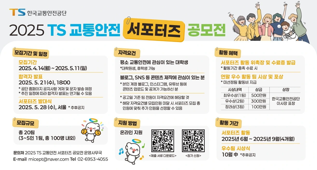 모집기간: ~ 2025.5.11 (일) 모집규모: 총 20팀 (3-5인 1팀, 총 100명 내외) 활동 기간 : 2025년 6월~9월(4개월) 활동내용 : 1) 매월(1회) 교통안전 콘텐츠 제작 및 업로드 2) 우수팀 선정 및 시상을 위한 팀별 포트폴리오 제출 및 발표(1회) 활동혜택 : 1) 서포터즈 활동 위촉장 및 수료증 발급(활동기간 충족 수료 시) 2) 우수 활동 팀 시상 포상 접수방법 : 네이버폼 온라인 지원(모집 공고문의 QR 코드 스캔) 선발방법 : 서류심사 ※ 합격자 발표 : 5. 21(수) 문자로 개별 통지, 공단 홈페이지 공지사항 게시